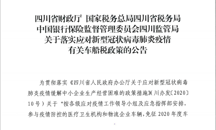 省财政厅、省税务局、中国银行保险监督管理委员会四川监管局关于落实应对新型冠状病毒肺炎疫情有关车船税政策的公告