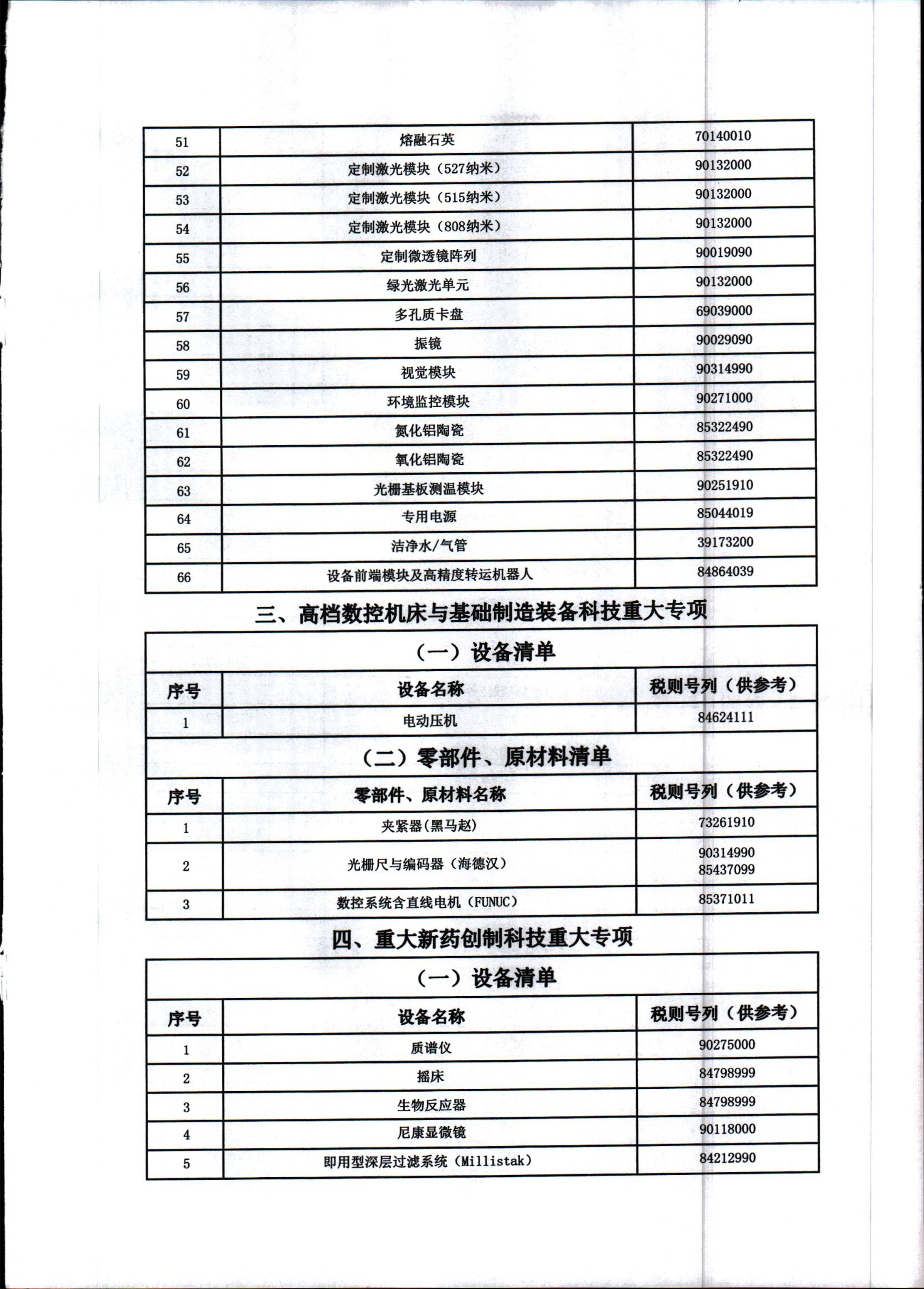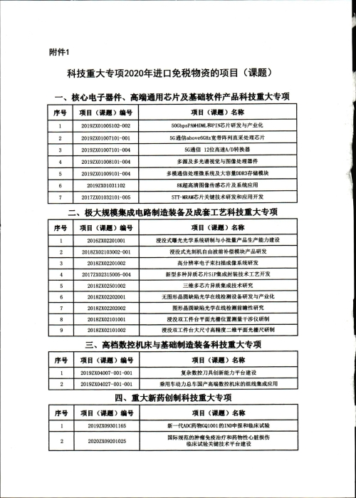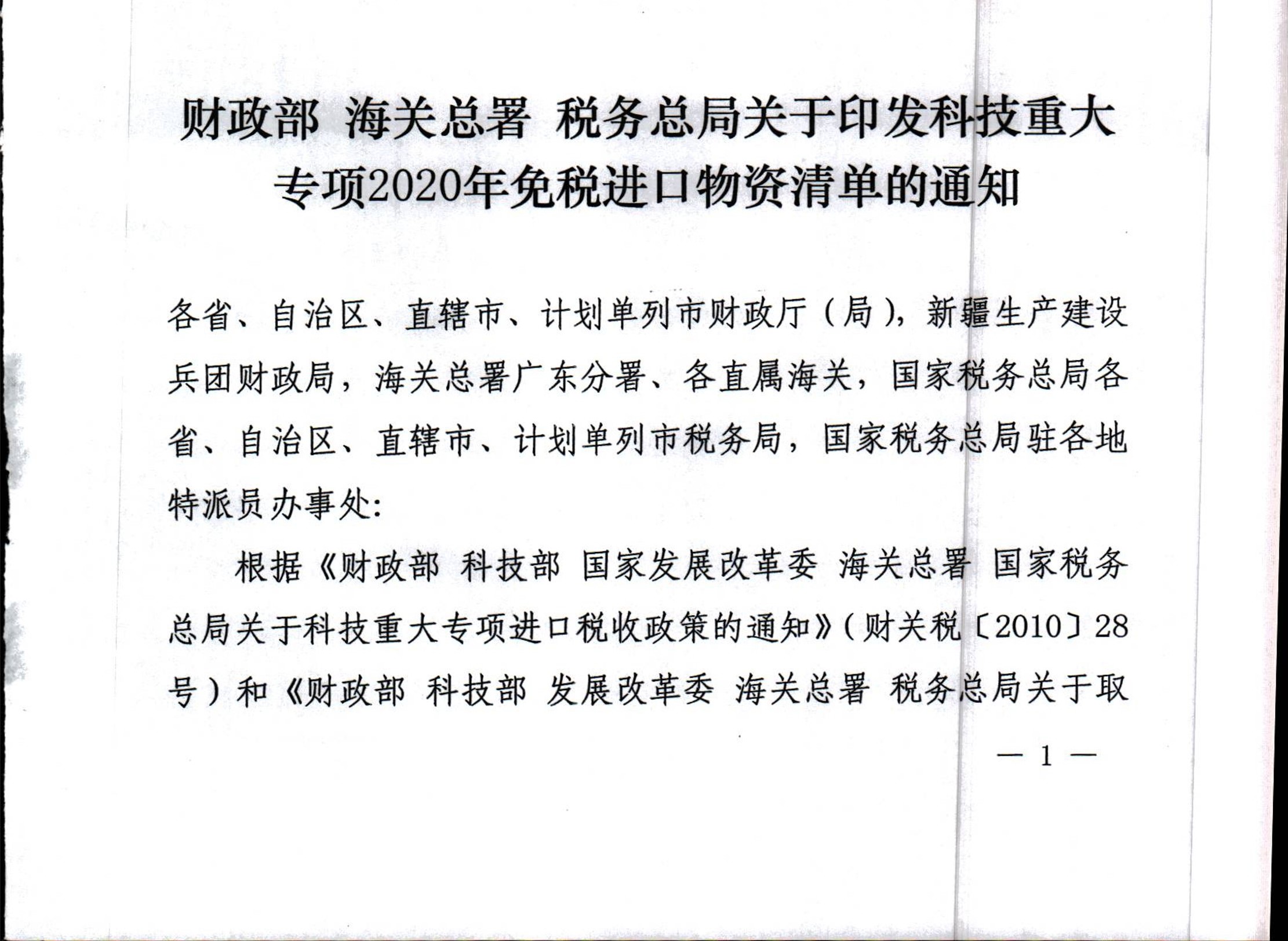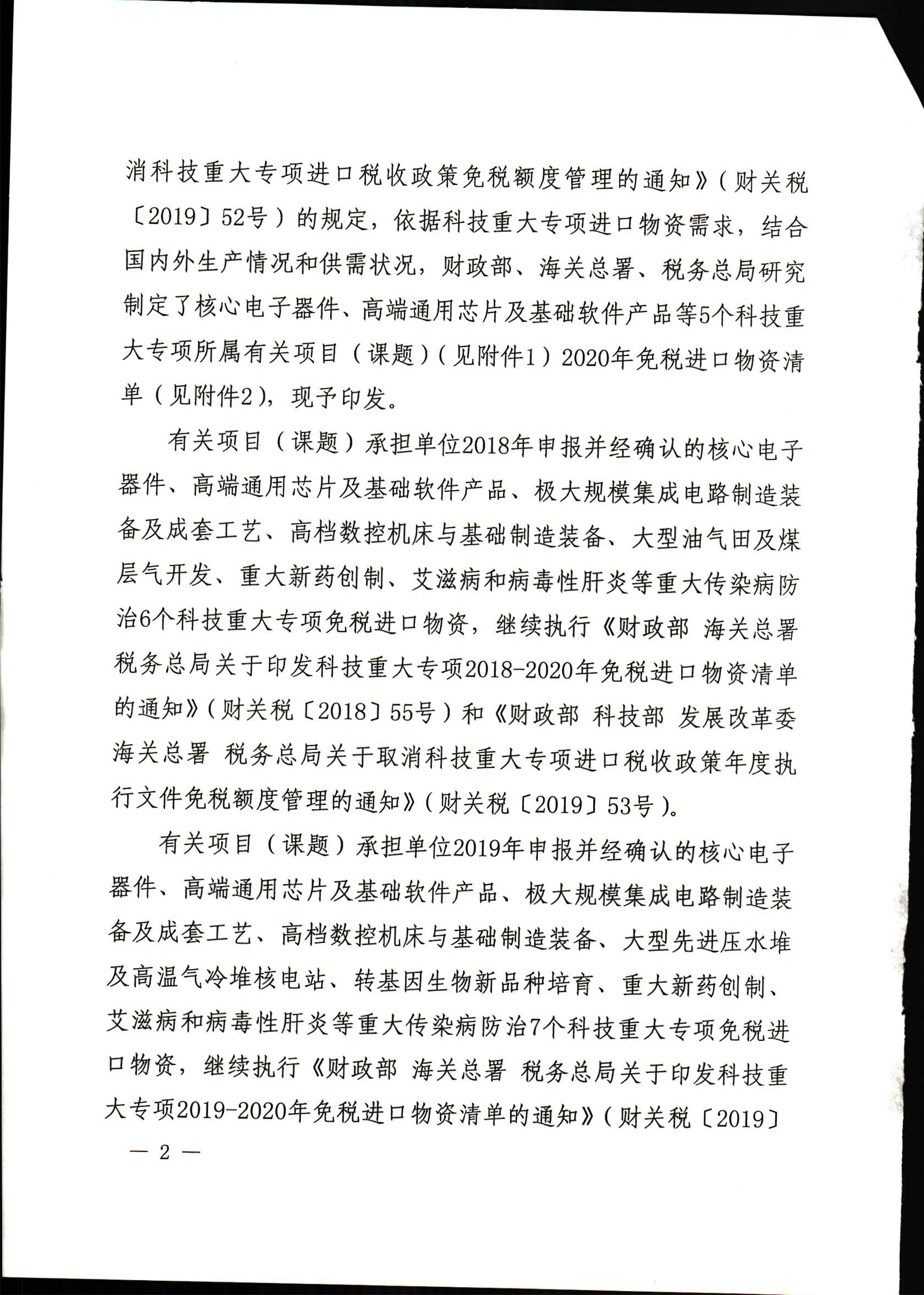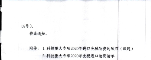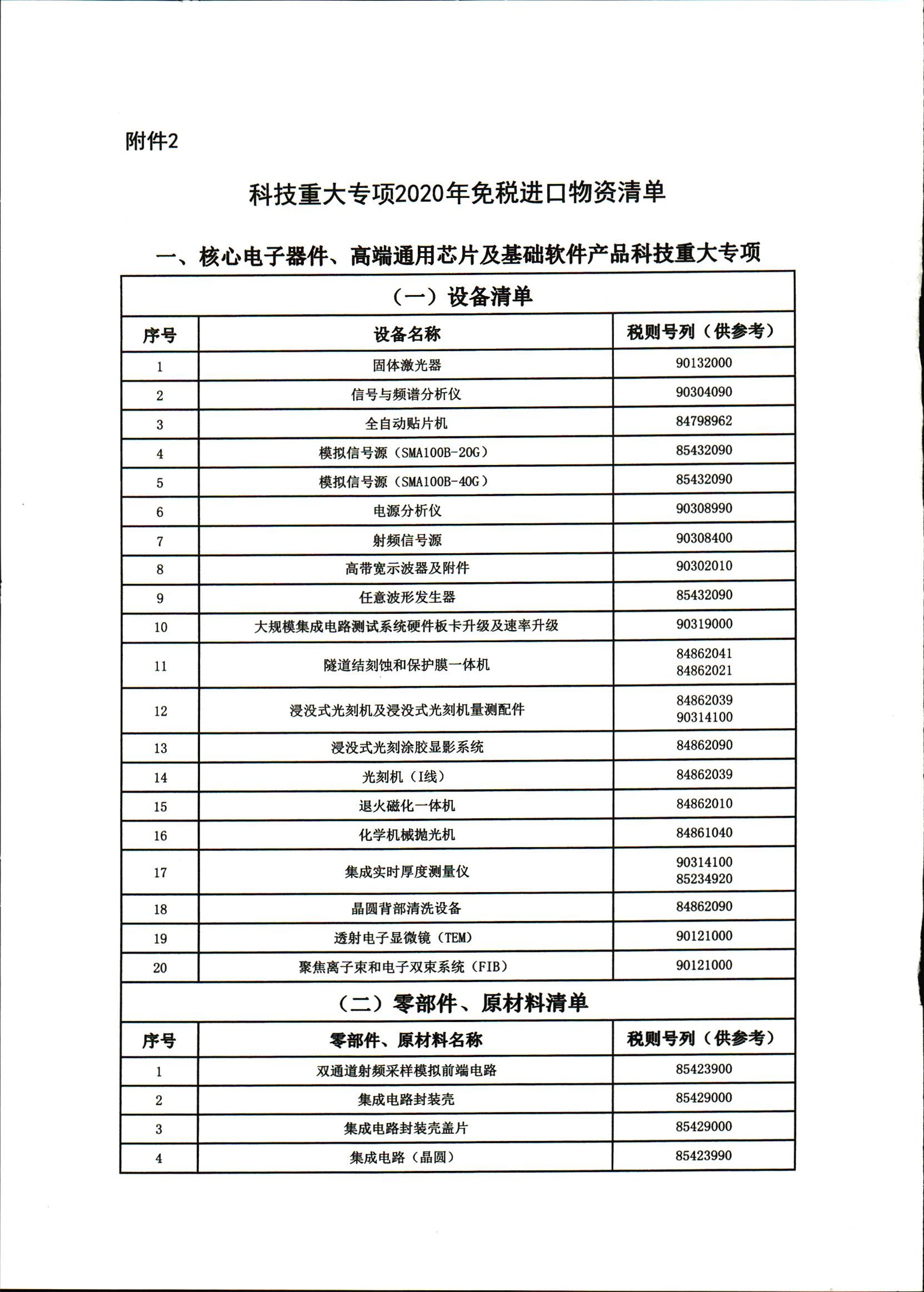 关于印发科技重大专项2020年免税进口物资清单的通知